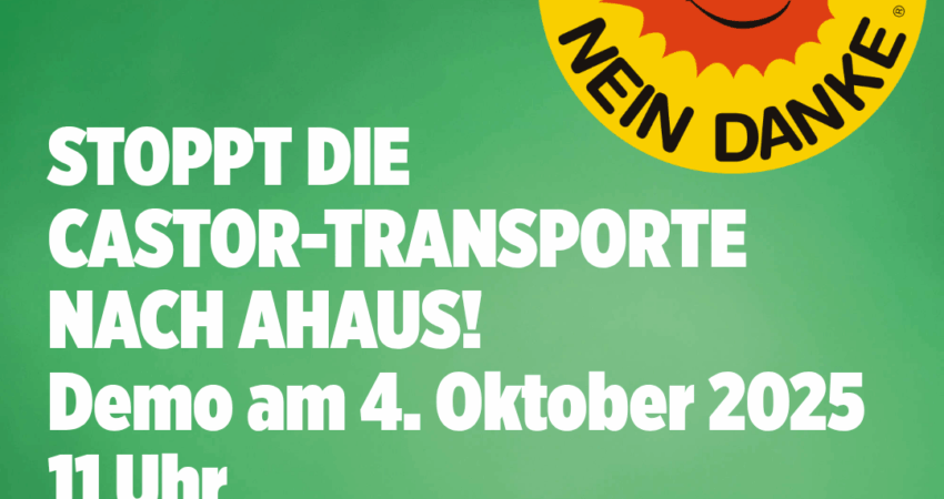 WIR UNTERSTÜTZEN DEN BREITEN PROTEST GEGEN DIE UNSINNIGEN CASTOR TRANSPORTE UND RUFEN AUF: KOMMT AM 4. OKTOBER NACH AHAUS! AUFTAKT IST UM 11 UHR AM RATHAUS, ANSCHLIESSEND GEHT ES GEMEINSAM ZUR TRANSPORTSTRECKE. SETZEN WIR EIN STARKES SIGNAL – FÜR SICHERHEIT, TRANSPARENZ UND EINE VERANTWORTUNGSVOLLE ATOMMÜLLPOLITIK.